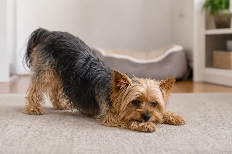 - Dolor abdominal, que puede manifestarse como postura de rezo (perro con el trasero elevado y el pecho pegado al suelo)